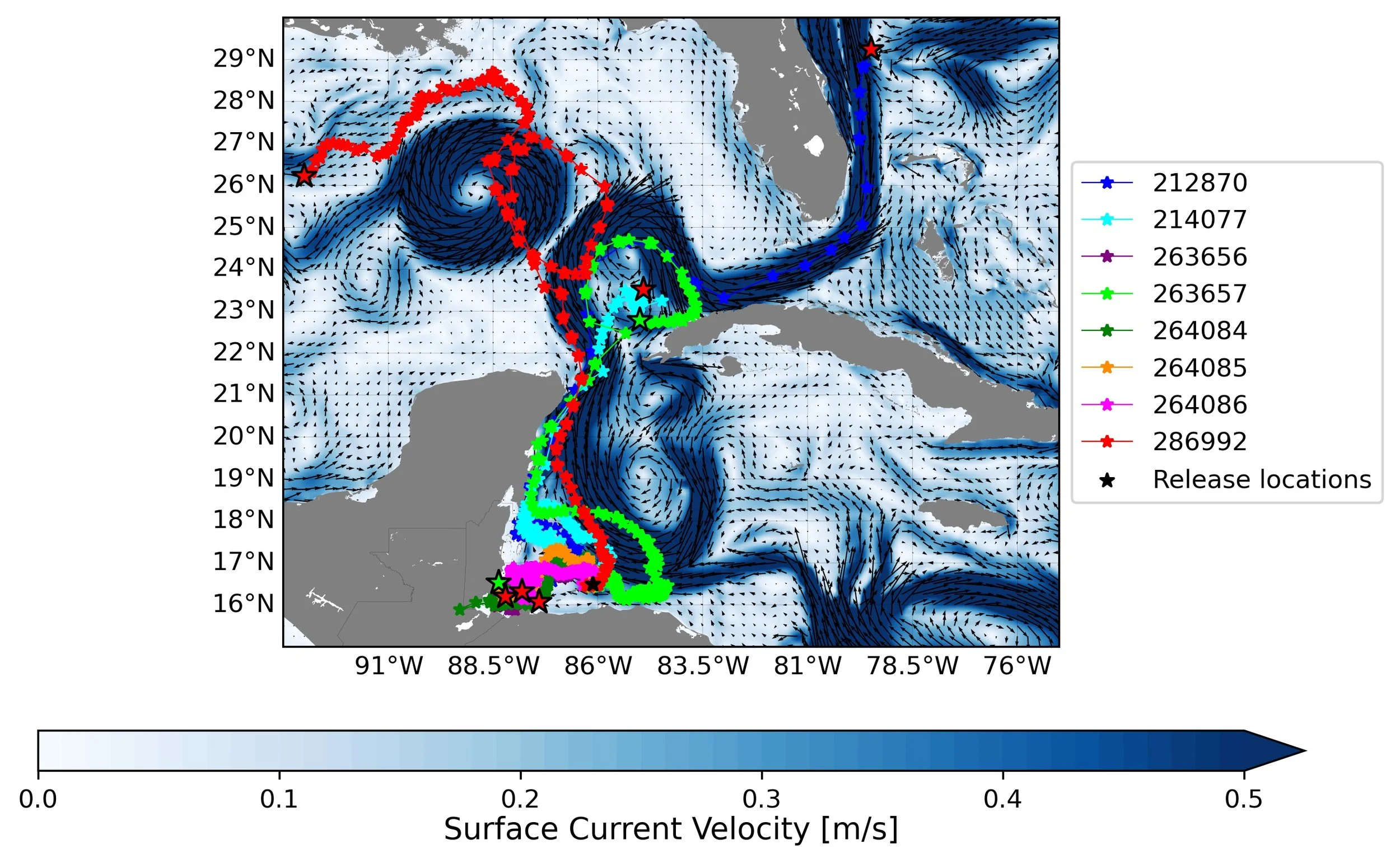 Two turtles took off in the current heading north and then parted ways. Turtle 992 swam into the Loop Current in the Gulf of Mexico, making a full loop before heading west! The Loop Current is a swift moving current that can vary in size throughout the year, but it generally enters the Gulf of Mexico before looping back around and heading towards the Atlantic through the Florida Strait. Meanwhile, Turtle 870 is now heading up the Gulf Stream to the east of Florida, seemingly followed by turtles 657 and 077. Two other turtles remained closer to the release location, associating with neritic reef habitats off the coast of Honduras and Belize for the past 8 weeks.