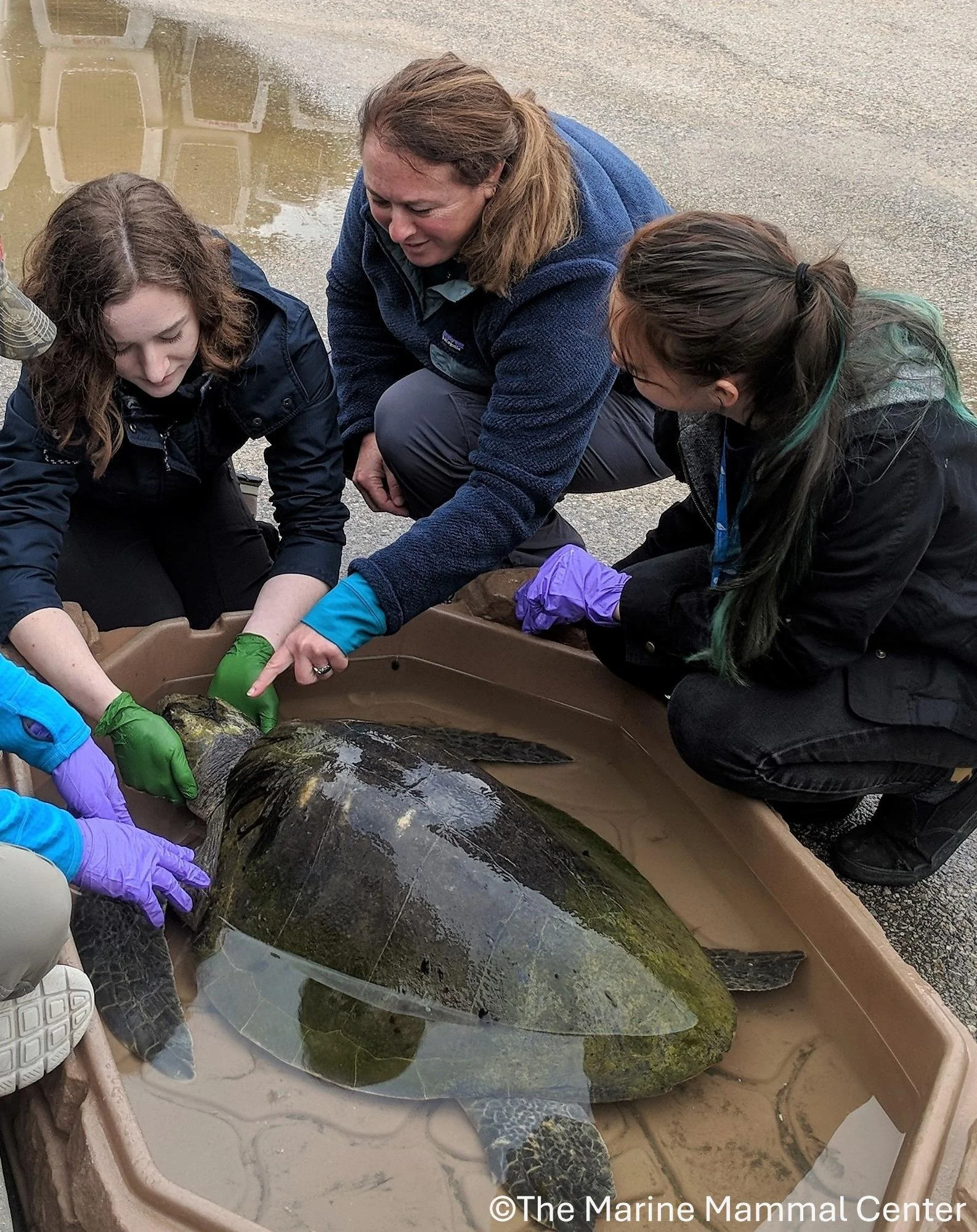 Brenna Eikenbary (left) and Dr. Heather Harris (center) evaluating a stranded sea turtle at The Marine Mammal Center in 2019